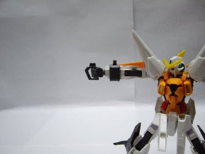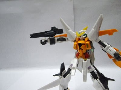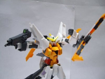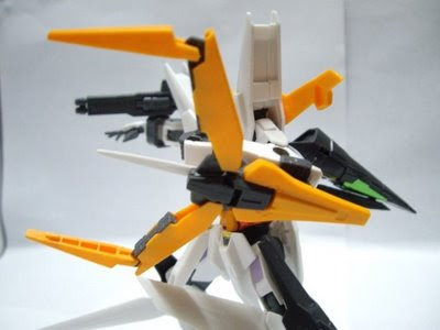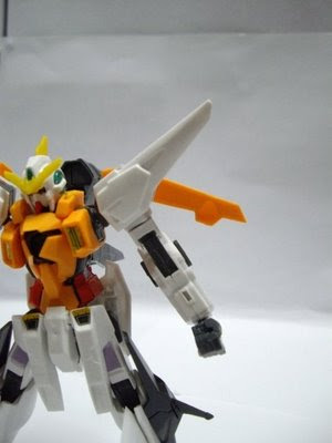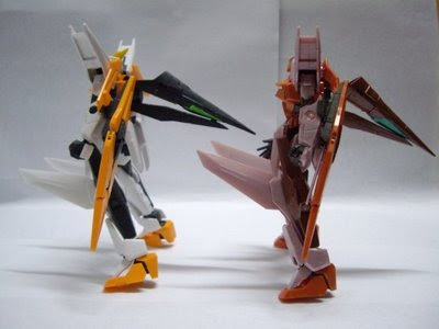 The biggest seeable difference is te color scheme... XD I don't have the original Kyrios, but I do have the Trans-AM version. I just couldn't get the original one as I guess it has been in the market for quitea while already. XP If you can tell, the Trans-AM version is more sharper looking than the bootleg. It also don't really drop its weapons as bad. But for some reason, the right arm likes to sag down... =/ Part 7: Conclusion HG Kyrios As A Whole The HG Kyrios was infamous for one problem, the "backpack". The design of the back of the Kyrios caused the HG kit to be a bit back heavy and can easily tumble off its feet. This is also contributed to its rather small feet design. If you already own a HG Kyrios, you'll understand what I mean. A stand is quite necessary for this model if you want it to stay ina dynamic pose. =) The Bootleg Pros # The main body is very sturdy! # It can transform well unlike the TT HG Union Flag. # Very close to the original. # Fair price Cons * V-Fin and armaments likes to drop down easily. * Some parts had molding errors (helmet and arm). * Seam lines are very obvious. All in all, the model kit isn't so bad. Well, the armaments are a bit lose on this guy but at least they can still stick on! XP Well, if you're in for a Kyrios model kit and do not have the original or have no chance of buying the original, this kit gets my approval for purchase. =)
