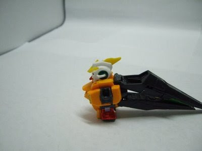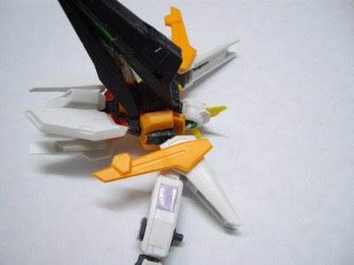 There seems to be nothing wrong with the legs. =D Part 5.6: Waist Waist is totally fine. If you look closely, the beam sabers are mounted onto the rear skirts. Part 5.7: Armaments The shield is quite okay but if you force it a little bit, it might open up into pieces(doesn't break). Part 6: Kyrios Allelujah: "I have control." "Get away from my bottle of water, you *******s!" Part 6.1: Up, Left, Back, Right! The plastic looks a bit cheap, but you can't do much to prevent that if you're buying bootlegs. XP Part 6.2: Articulation & Gimmicks Arms can go really high thanks to its transformation ability. =) Legs can go pretty high up but gets blocked by the front skirt. *pew**pew**pew* in rapid succession! >D Two ways you can equip the beam sub-machinegun. The arm mounted way is for when in flight mode though. Then again, the weapon tilts down a bit when held in the hand... no matter how it is held, it can easily fall off sadly. Hallelujah: "Isn't this fun?! RIGHT ALLELUJAH?!" The shield is not so bad though can fall off the arms quite easily like the original FG Kyrios... Don't fret though, the claw works quite well. =P Part 6.3: Transformation First, take off the legs. Taking off the weapons helps to maintain your blood pressure. They just won't stick onto the Kyrios well enough! D= Also, take off the cover of the hole to connect to an action base under the Kyrios. I didn't really put it on in the first place. Take off the black part on top of the legs and replace them with this one singular "V" shaped piece. Hopefully you can tell from these two photos. I'm to lazy to explain this part in words. XP Now, onto the top part of the Kyrios. Open up the backpack. Make sure the "ponytail" of the Kyrios slots into the hole as seen above. Move the arms down and bend them a little, the orange parts are straightened and pull out the two clavicles near the "cockpit". Looks quite nice for a bootleg, ne? =) At any rate, Kyrios just looks wrong when you look from underneath...