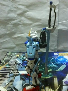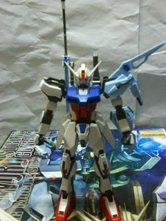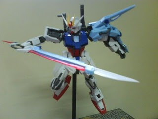 Strike's "main weapon and shield". Actually this beam rifle and shield are only used by the Strike when it uses the Aile Striker pack, which I do not have currently. The Aile Striker pack has been shown in the anime to be fast and versatile, making it the main choice of usage by the main character, Kira Yamato. The Aile Striker pack also have a beam saber(or two, not sure) which can be used for short range combat.