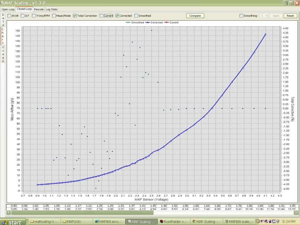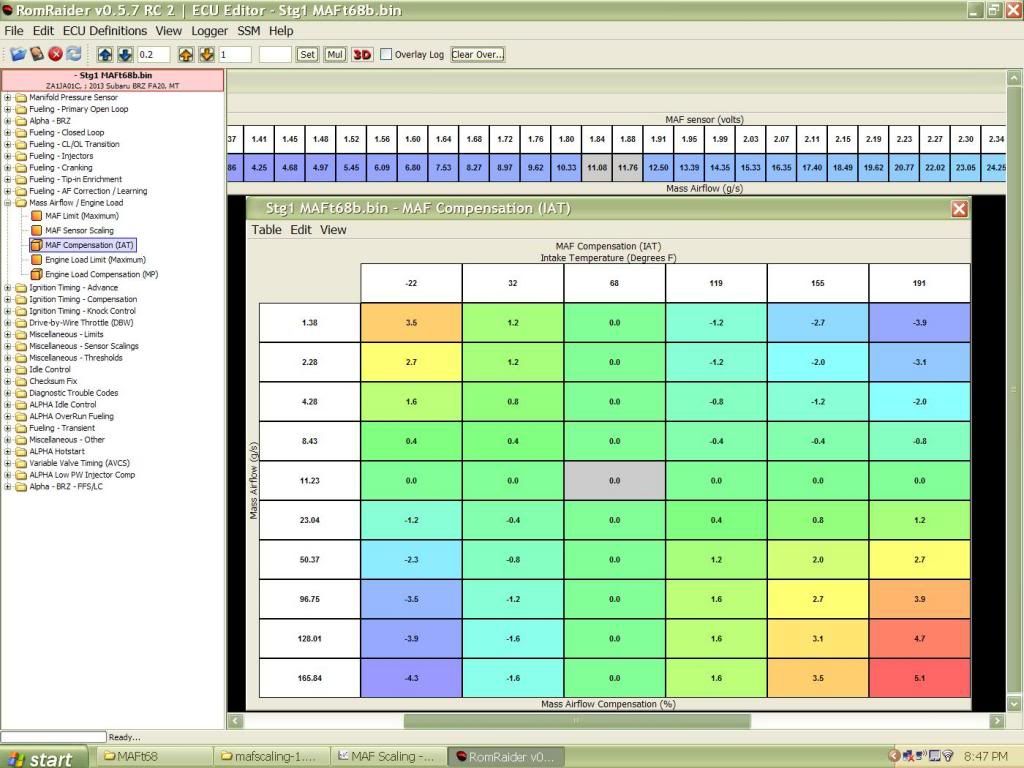 Here the CL error result of a MAF scale I dialed for 68 degrees ran at around 80 IAT's. ![]() And here is the compensation table and part of this maf scale for reference: ![]() As you can see The areas with 0 or the least amount of compensation remains the most accurate in the higher temps. The areas with more compensation resulted in error in fueling. Areas with + comp resulted in negative fuel trim, and the area with - comp ended up with positive fuel trim due to error. I'm not typically this anal, but this is messing with my head.... ![]() It seems that the compensation should be lessened if not zeroed all together. Thoughts? Last edited by solidONE; 05-24-2014 at 12:31 AM. |