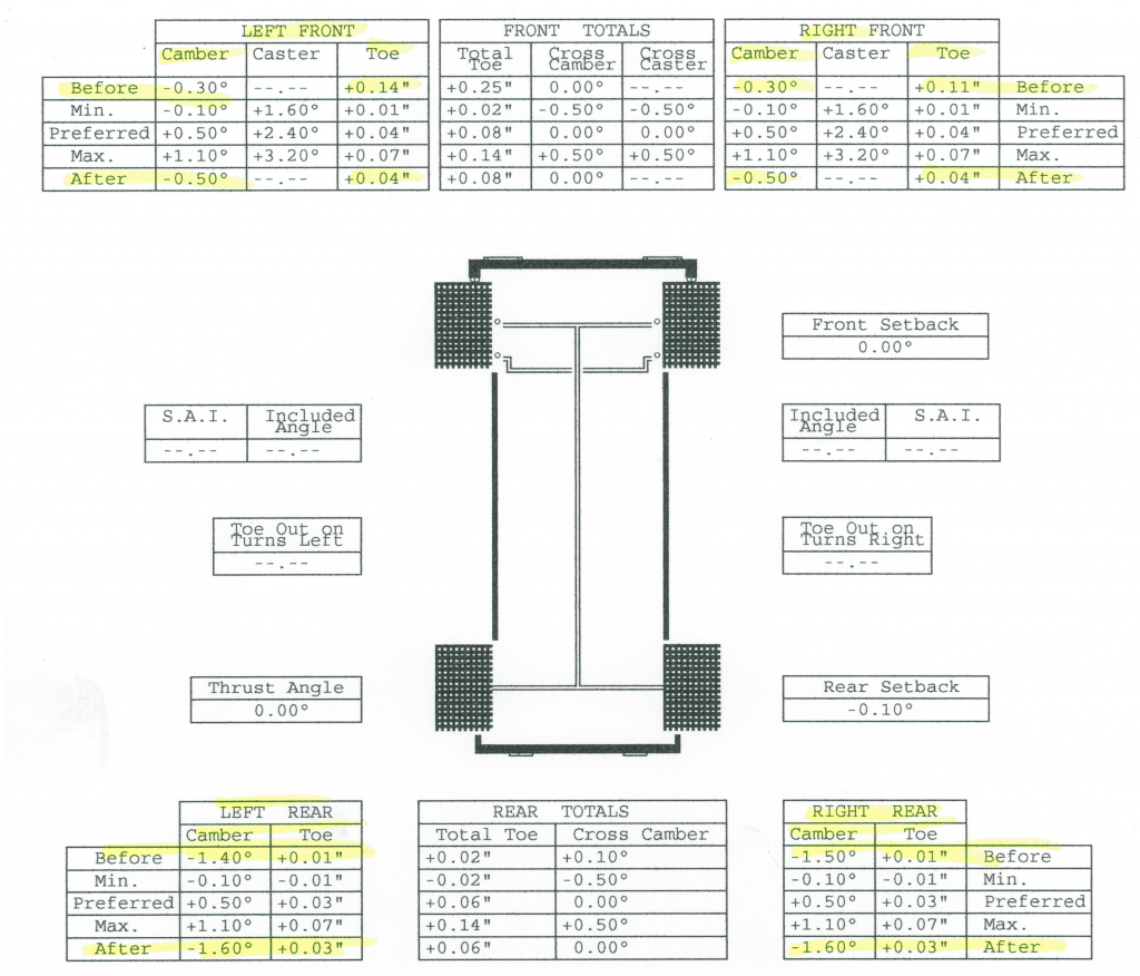 ![]() This was the alignment I got before I fixed the problem with the anti dive kit. The front drivers side is where the issue was. |