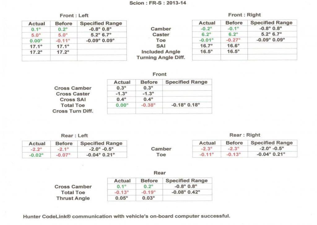 Here is my alignment sheet: ![]() ![]() I'm lowered. Just a fun summer street car. The only thing I think I'm concerned about is the front left caster - is there any way to adjust this? Should I be worried about any of the specs on the rear? The rear tow is out too. Last edited by STS-V; 06-29-2014 at 02:27 PM. |