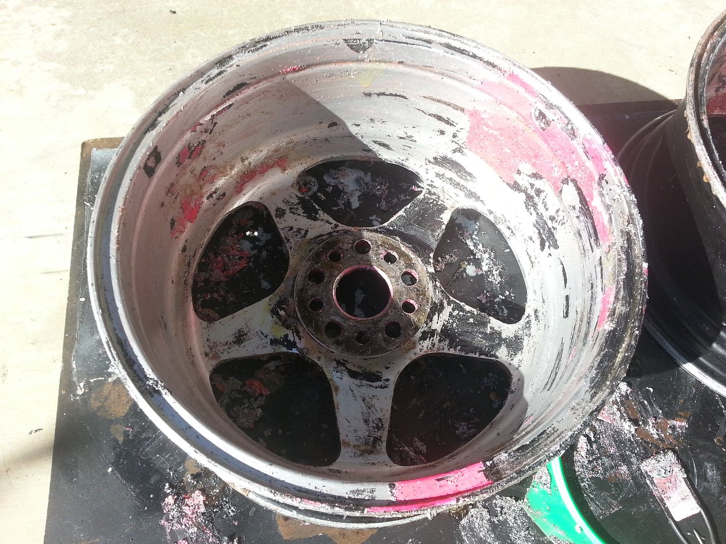 ![]() Fast forward to now, that same set of wheels I sold to a friend which he used for Autox for years, was available for me to purchase again (I'm getting tires for the new Autox season due to the change in tire wear rating) but were plastidiped in pink: ![]() I knew the powdercoating underneeth had seen a lot of wear, so I was contemplating having them re-coated. But everyone I talked to said $400+ to blast and powder coat a set of wheels. Since these are going to be "racing" wheels, I don't really care about looks but I sure ain't runnin pink wheels! So I did some searching, and found this video: [ame="https://www.youtube.com/watch?v=fCdr8RWQd64"]Paint Strip Off a ROta - YouTube[/ame] I was like "Wow! Same wheels, and it looks so easy!". More searching and some time later, I bought some paint stripper from Napa Autoparts... Tried it last weekend, and it didn't go so well! You need to put it on THICK not thin, and it works, but I used a whole quart and it barely took off anything from the outer spokes: ![]() So I did more searching, realized that the RIGHT stuff to use is the "Klean Strip" Aircraft paint remover, and you need a GALLON of the stuff for 4 wheels and put it on REALLY heavy! (Its a Gelatin like substance, so keep it thick and apply generously) ![]() You do need to be VERY careful with this stuff! Use cloths you don't want to keep, wear kitchen gloves ON TOP of some rubber gloves, wear a mask, don't get it on ANYTHING you don't want it to be on. It stinks for sure, but Brake Cleaner is worse in terms of fumes. Its also water soluble so its actually not to hard to clean up. ![]() At any rate, after a few coats today, learned a few more things... My method was to POUR it directly onto the wheel and move it around so it stays thick. And as it starts to peel off, brush it again and brush the paint thats coming off so it gets the next layer. This was probably the most efficient, yet VERY messy, way I got it to work, and the results were damn good: ![]() TEN YEAR OLD WHEELS THAT LOOK NEW! YAY! I'm going to use some artisan polish to clean up some scratches and stuff, but I won't be doing a "chrome" like polish, not really into that look and these are beater wheels. But I'm very happy with what I learned from this and how much I saved (spent $60, but thats cause I bought the first can at $20... I could have done this for $40 if I bought the right stuff first). |