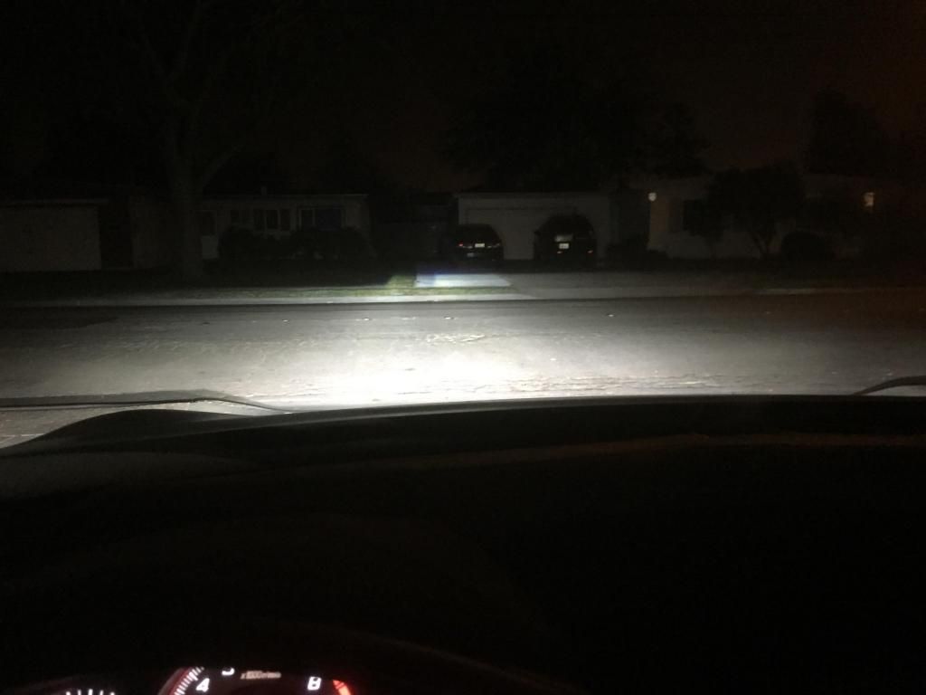 This shows the stock fogs on a fiesta ST compared to the Diode Dynamics fog lights with the same exposure etc. Only difference you see in the photos is how much better the Diode ones are. Also, you can't quite tell in this image, but the cutoff is pretty darn good as well.