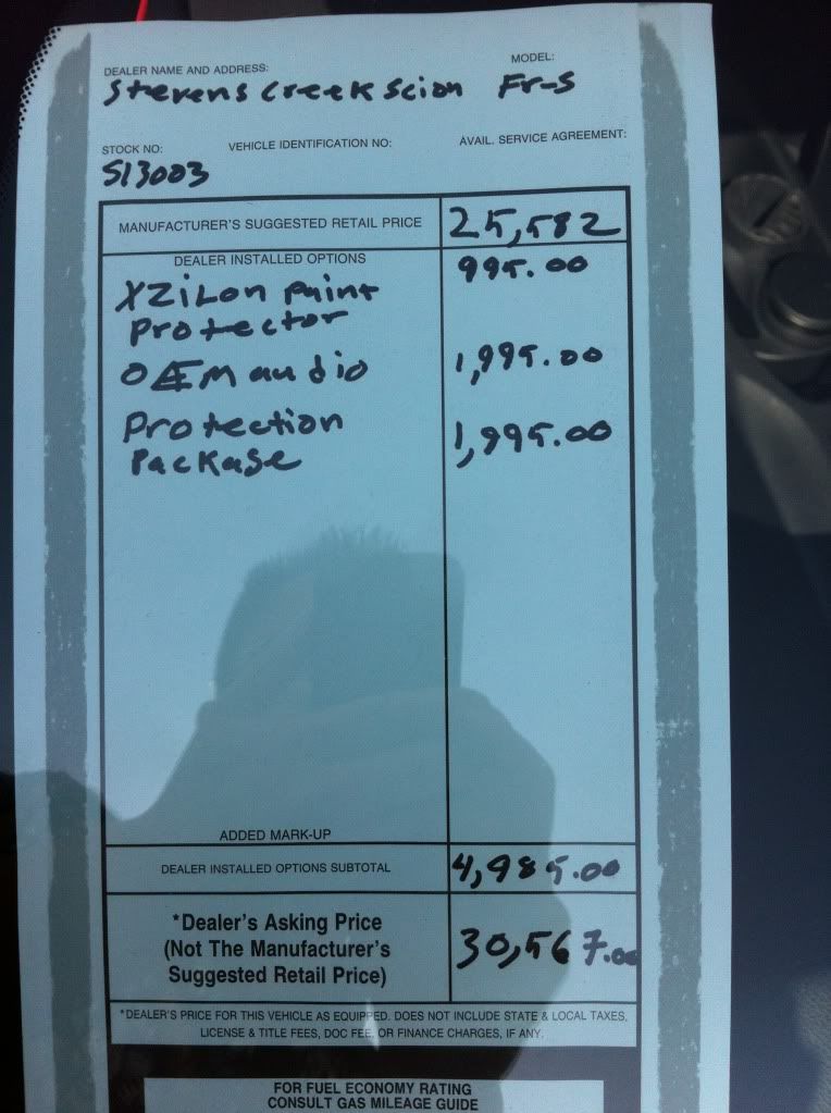 Really ugly: While I was staring at the last list of overpriced mystery items, a salesman came out to see how I was doing. I asked what exactly was all this additional stuff. He said, "I don't know. They just installed it." I looked at him in disbelief. Then he told me the doors were unlocked so if I wanted to take a look, then I could go ahead. And then without saying another word, he went back inside the showroom and never came back!