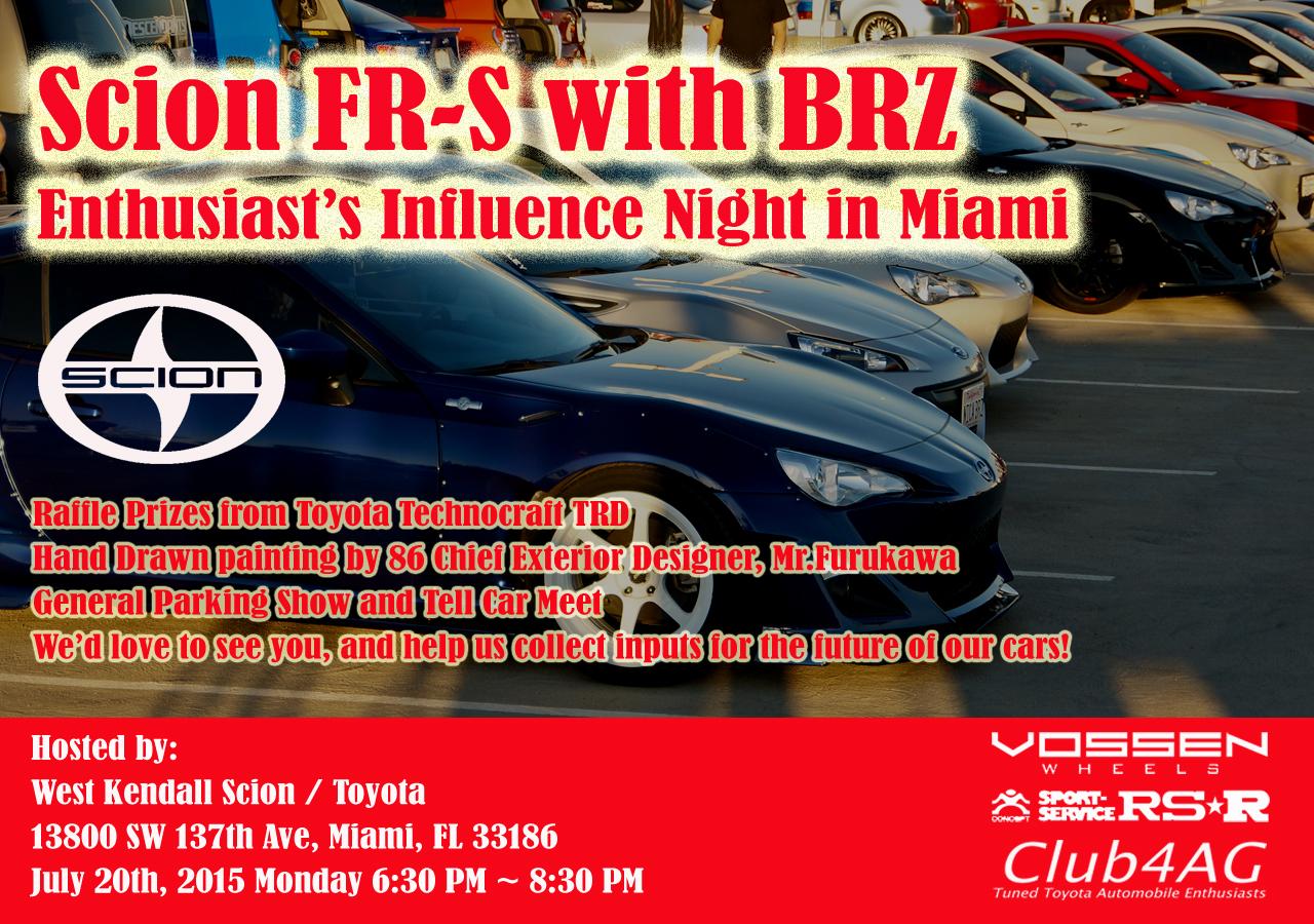The event will be at West Kendall Scion, 13800 SW 137th Ave, Miami, FL 33186 Starting at 6:30 PM ~ 8:30 PM. It is an open invitation event, invite any sports car fans you'd like. FRS/BRZ owners have preferred parking. See you soon!! The event will consist of a general car meet and greet A raffle prize give away of TRD Technocraft Japan Toyota 86 parts A contest to win a hand drawn painting of Toyota 86 by the Exterior Styling Designer responsible for the FRS/86/BRZ, Mr. Furukawa of Toyota Motors Japan. And lots of FUN to meet all of you in person with a few guests from Japan (wink wink) and myself. SO SEE YOU ALL THERE!!! It will be small and informal but one of the most important event to shape the future of FRS/BRZ world-wide, and I'd like to collect inputs!