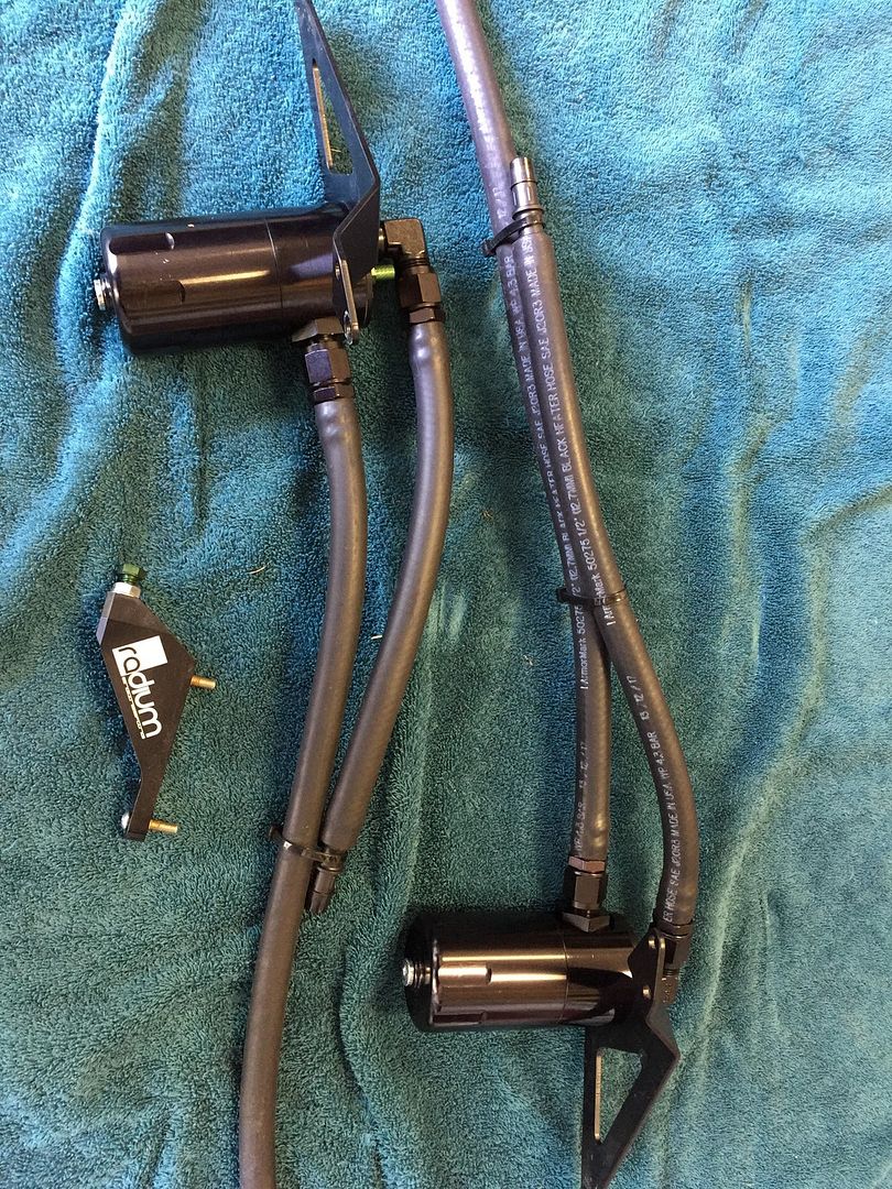 Selling my set of Radium Engineering catch cans. This is for both the PCV kit and crank case kit. Have maybe 3000 miles on them and are in like new condition. Cans are assembled and hose is pre-cut and installed so installing these will be easy. I would like to sell my Radium Engineering brake master cylinder stopper with the catch cans as a package deal. It too is in like new condition. $350 shipped and paypal'd for both.