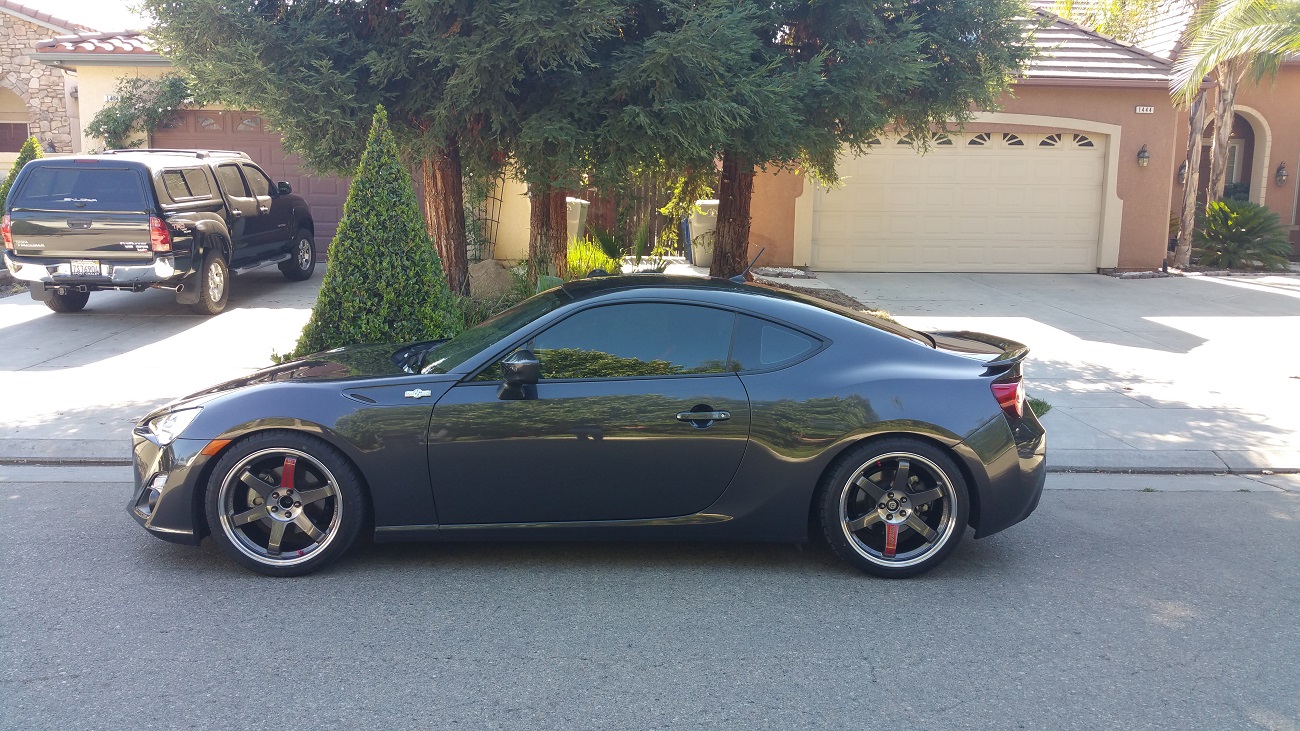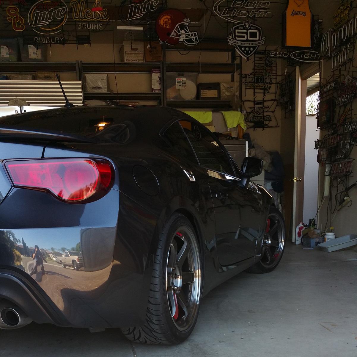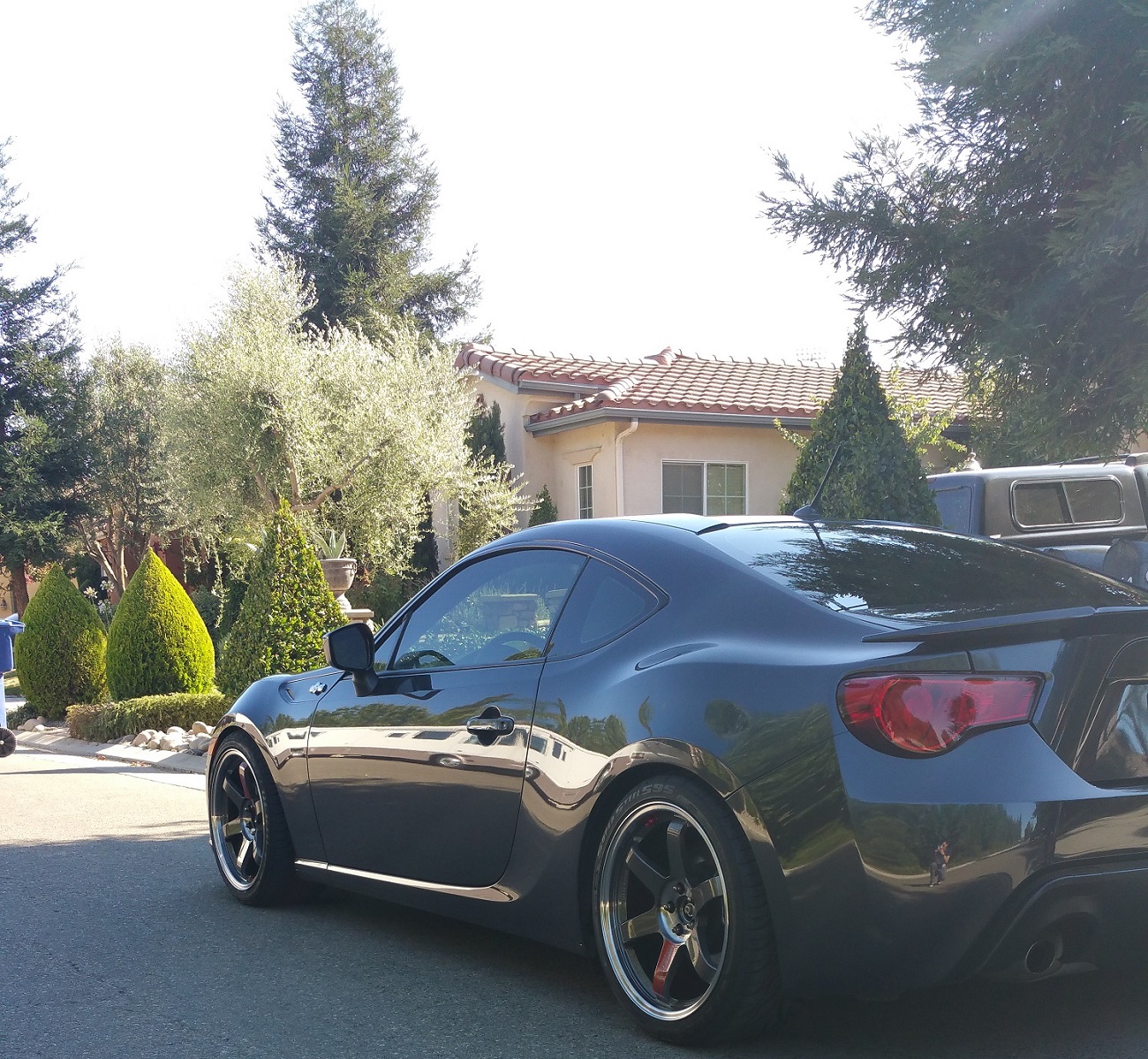 I want to use this post as a way to show my progress up till now and in the future as well. Please feel free to post pics of your rides and share your thoughts! Here's the mods and specs of whats been done so far. Suspension: Stance Coilovers, SPC control arms. Dropped alittle over an inch. (The rear is a quarter inch higher than the front but I will be lowering it to match as soon as I find some spare time) Wheels: VOLK TE37 SL, 18x9.5 +40. Color: Pressed Graphite Tires: 255/35/18 Camber: -0.5 Front, -1.5 Rear. (most likely going to match front camber to rear) Smaller Changes: Replaced "Scion" for Toyota Badges, Removed "FR-S" badge, VHT Nite Shade Red used on tail lights, Raceseng Shift Knob, Broadway rear view mirror. Update: Invidia N1 Exhaust with Ti Tips just installed! So far thats it, and FYI so far NO rubbing issues! Last edited by Jolt182; 07-30-2015 at 01:15 AM. |