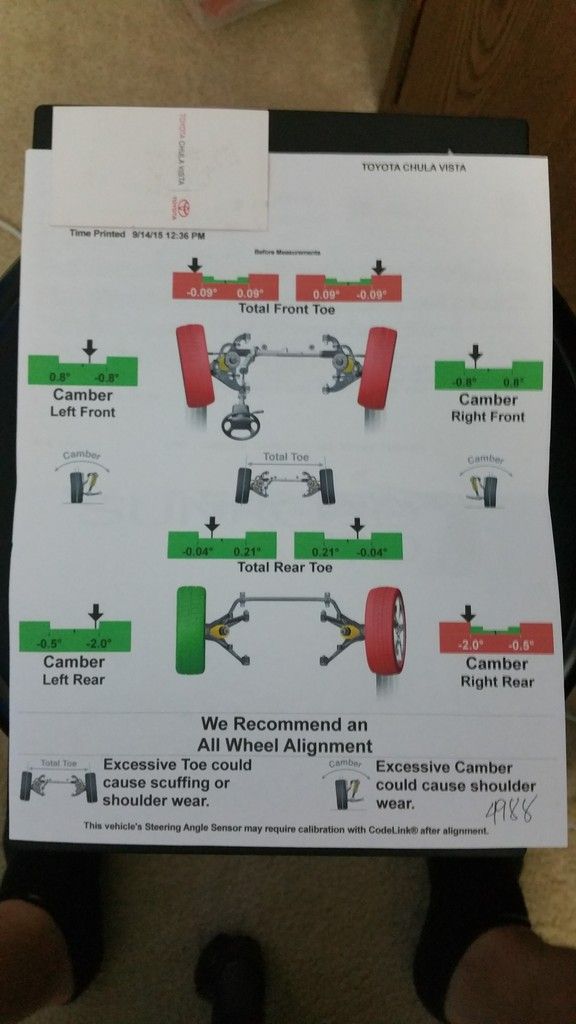 They said they couldn't align it because they don't have the kit for my car?? I asked what kit and I forgot what he replied with because I was so confused why Toyota couldn't align their own car. Here's the print out they gave me after the test, and I'm confused. Do I need control arms for the rear? I picked my car up at 6pm so every other shop was closed and I'll be trying again tomorrow, I might go to Subaru maybe? Any locals in San Diego know of any good alignment places where they could fix this when Toyota couldn't? I'm just confused! Any help would be much appreciated thank you! ![]()