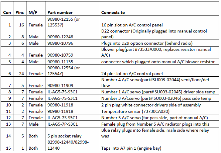 So this is a projected that I've been working on since I got the FRS. I wish I would have gotten a BRZ limited. Instead of trading car in for BRZ I've been slowly converting what ever I can from the BRZ. HID headlights, push button start (easy go), and lastly I've been wanting to ad the auto climate control. As of now I'm testing a unit I got off of eBay. I got it to light up and all buttons and controls work. So as of now no functionality but I figured out all the power wires and the pins on the connector. After much time of looking at wiring diagrams and info online. I've started creating a pin out for me to follow. I'm still trying to find a place to buy the 24pin connector. I was able to get the 16pin connector. It happens to be the same connector that comes with the reverse camera add on kits. I also have an extra Frs dash harness witch I've been de-pinning to make the 16pin connector. I have many questions and still need some help understanding how it works. If anyone has any info it would be greatly appreciated. At some point I'd like to make a DIY on this.